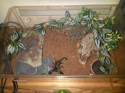 Description: 1 red clawed scorpion, water dish, 3 peices of slate, 2 peices of bark, some plastic plants